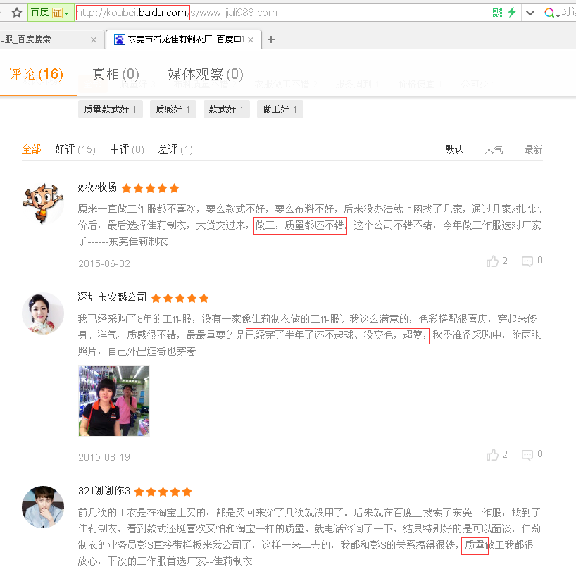 都是五星評價,這就是東莞市石龍佳莉制衣廠,在東莞地區(qū)專業(yè)從事服裝設(shè)計、生產(chǎn)、開發(fā)和加工服務(wù)。我們一直秉承“高起點、高標準”的管理理念,本著“質(zhì)量求生存,信譽謀發(fā)展”的宗旨贏得了客戶認同。我們憑著先進的設(shè)計、精湛的工藝生產(chǎn)出高品質(zhì)、高層次的職業(yè)服裝。