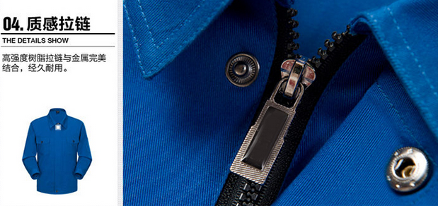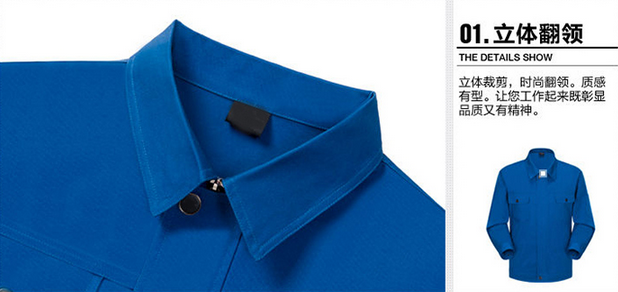 JL-QD241電子行業(yè)工作服以寶藍(lán)色為主色,領(lǐng)口處用黑色純銅紐扣搭配,質(zhì)感光澤,既彰顯品質(zhì)又結(jié)實耐用。